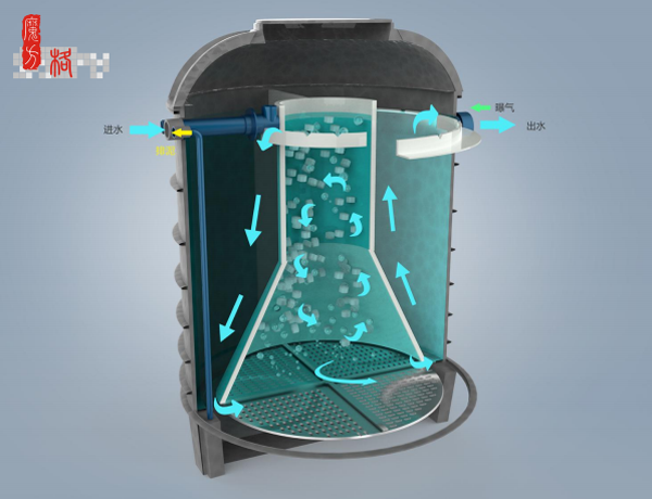魔方格产品。主要是针对村落分散处理模式,单套5m³/d,可串并联组合使用。装备采用“涡轮循环往复泥膜耦合脱氮除磷技术”,它是利用涡轮反应区的水气动力形成高度流化并自流至缺氧厌氧区形成往复循环处理,实现有机物及氮磷的去除。其技术优势中部的流化床状态,传质效果好,微生物活性强,耐冲击负荷强,去除效果稳定;同时整个设备仅配置一台进口气泵,故障点少,运行节能稳定。另外设备采用高分子材料一次成型,使用寿命长所以特别适合农村小微场合应用。